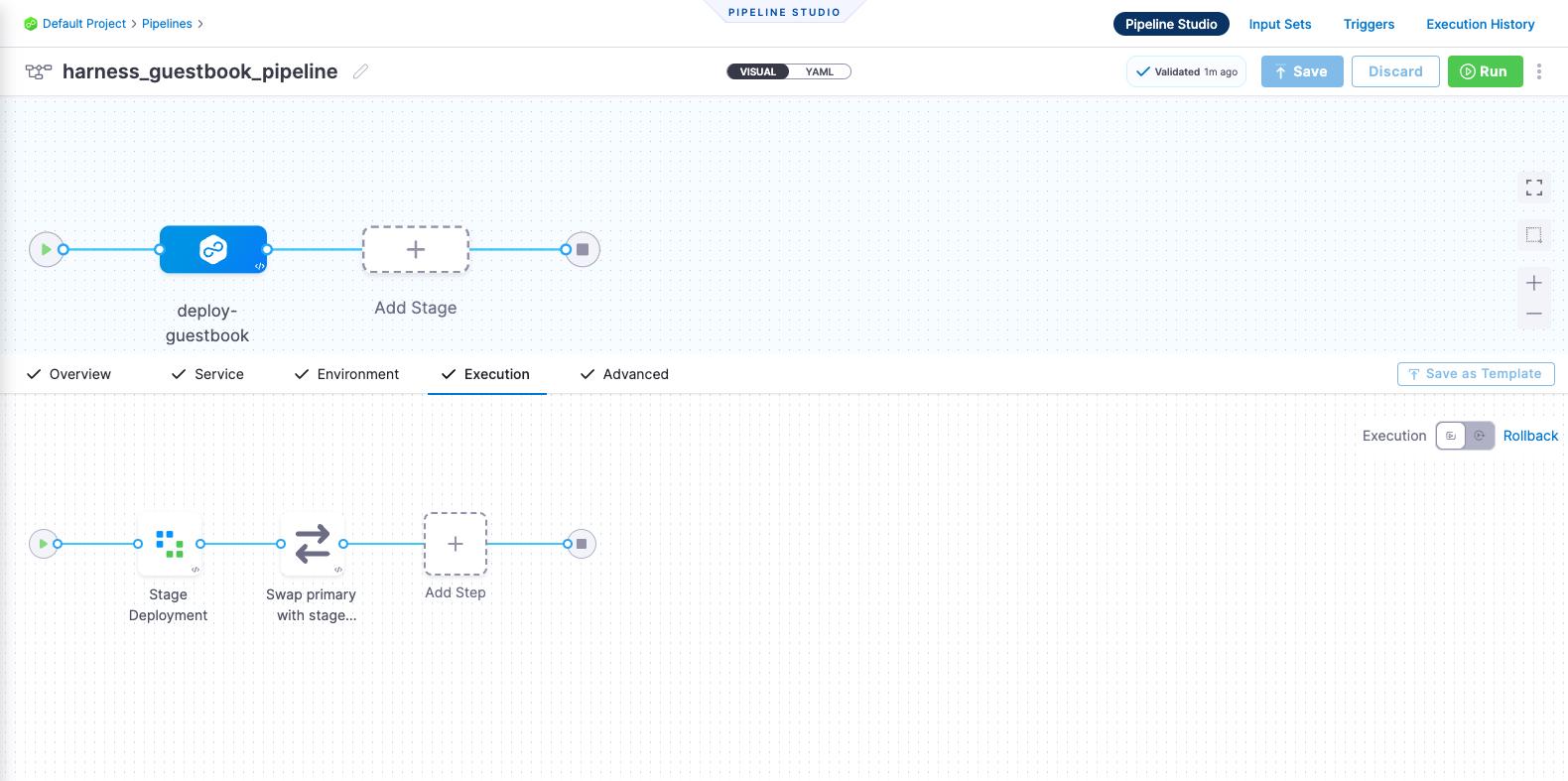 Harness CD pipelines allow you to orchestrate and automate your deployment workflows, and push updated application images to your target Kubernetes cluster. Pipelines allow extensive control over how you want to progress artifacts through various dev / test / stage / prod clusters, while running a variety of scans & tests to ensure quality and stability standards you and team may have defined.